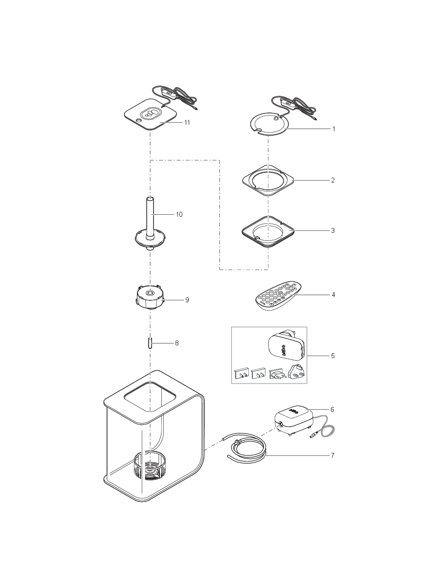 - Komplett sett, bestående av akrylakvarium, lysenhet, pumpe, transformator, luftstein, filterpatron, keramisk seng